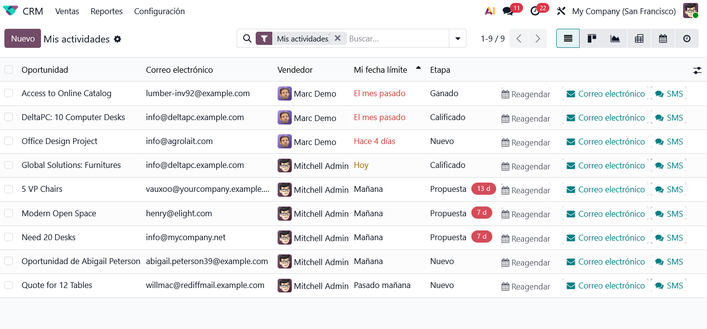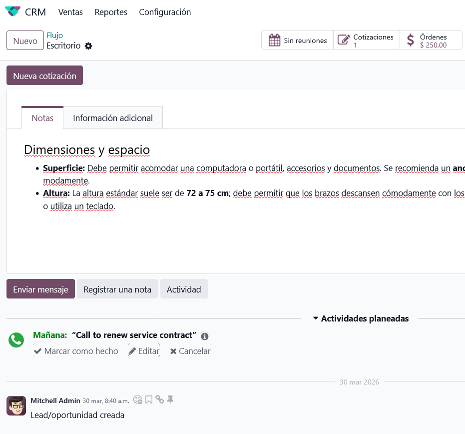Odoo CRM centraliza todas las interacciones en un solo lugar. Gracias al "Chatter" (el panel de comunicación lateral), puedes enviar correos electrónicos personalizados y mensajes de WhatsApp directamente desde la ficha del prospecto. Además, permite registrar notas internas para que tu equipo esté siempre alineado y utilizar el botón de actividades para programar llamadas, reuniones o tareas pendientes con recordatorios automáticos.