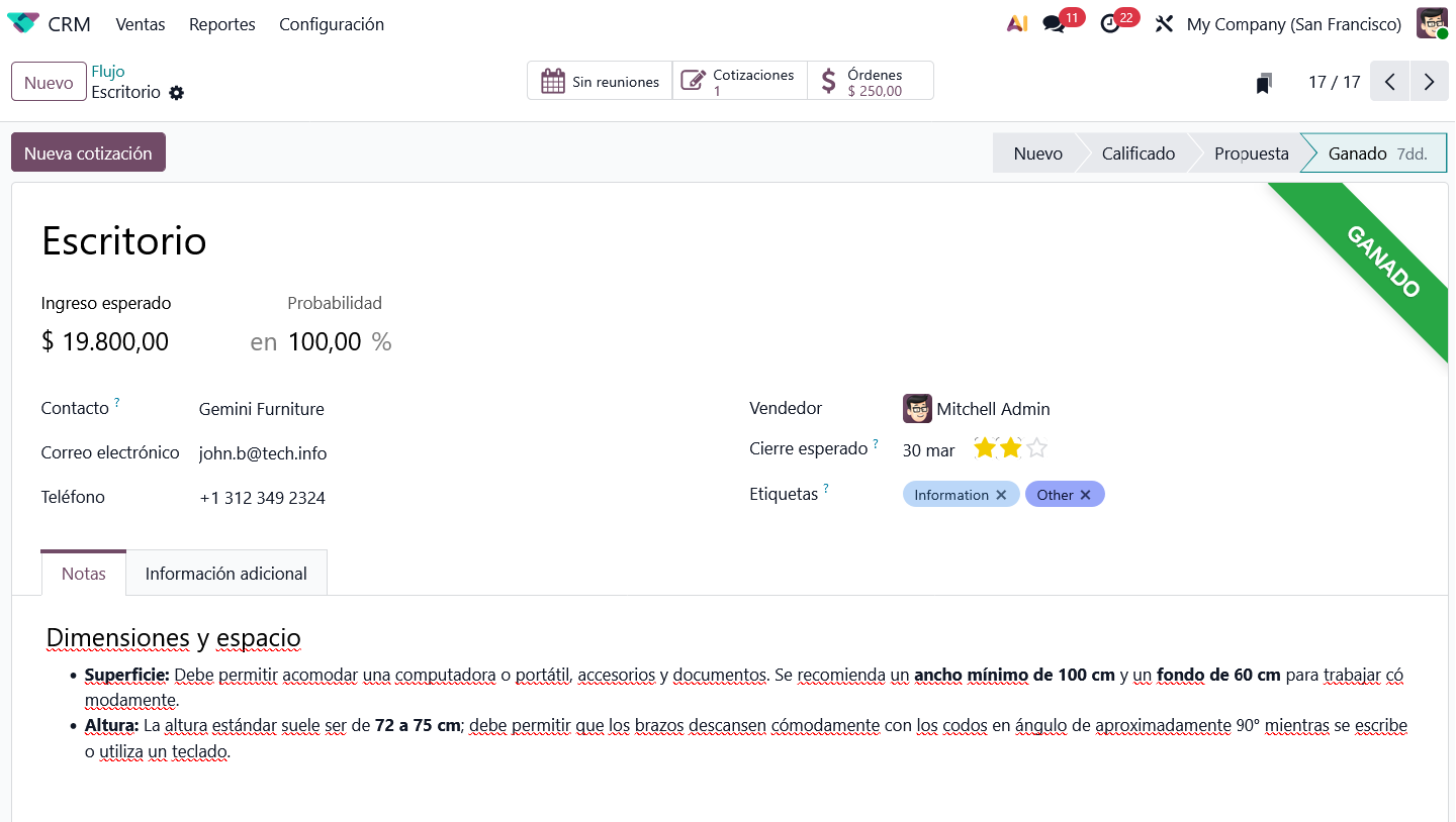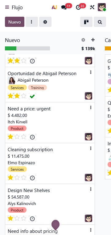 La interfaz de Odoo permite visualizar todo tu ciclo de ventas mediante un sistema de Tablero Kanban. Puedes arrastrar y soltar prospectos, priorizar actividades y tener una visión clara de qué negocios están listos para cerrarse.